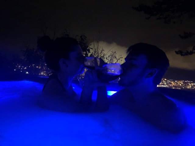 Once the sun had set and the snow had slowed we braved our swimming costumes and scurried out to the hot tub! Sat in the hot tub with glasses of wine and the steam swirling around us with the town below us and the mountain behind was a wonderfully peaceful and relaxing experience.