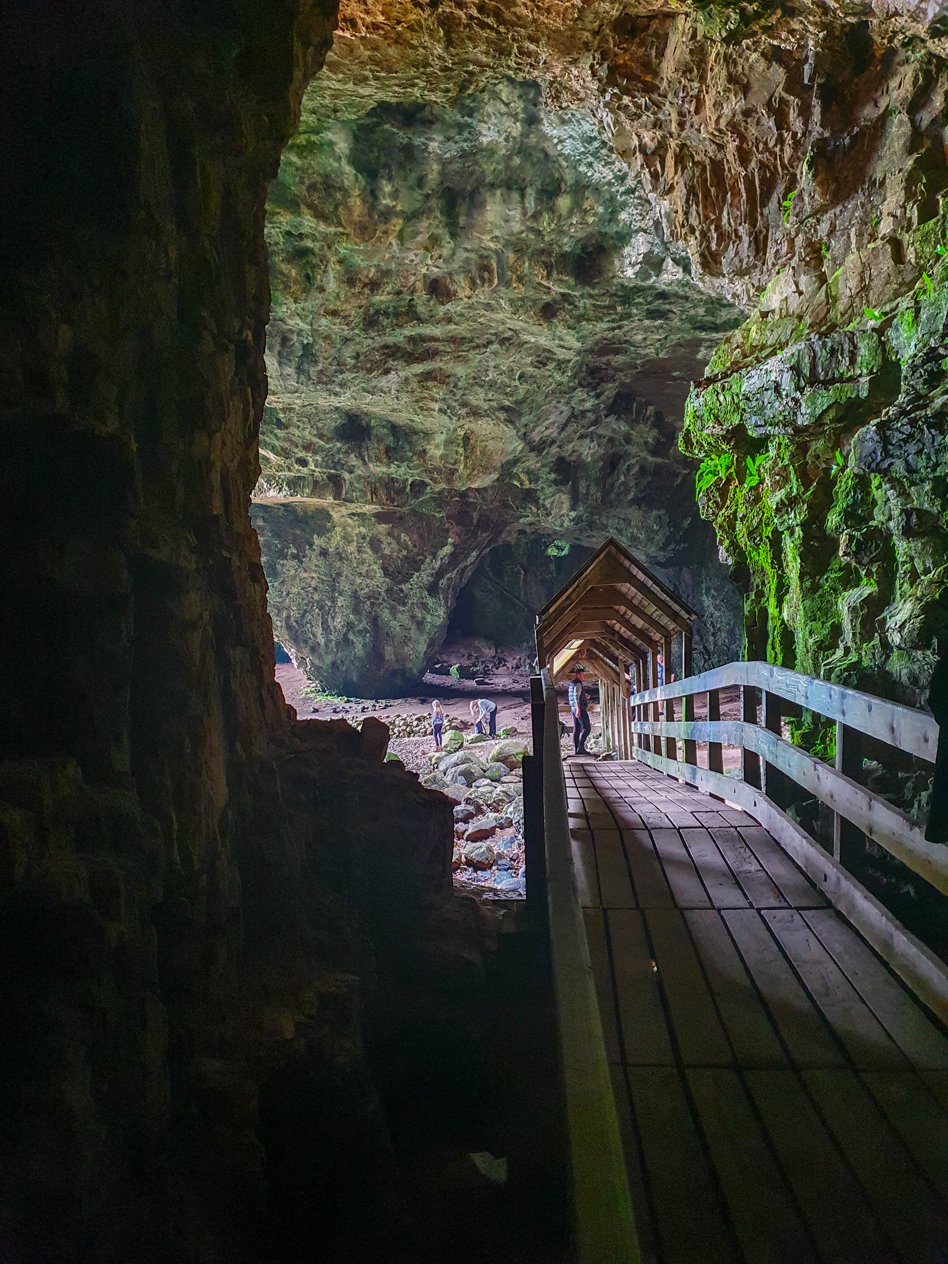 The cave is a large sea water cave with a big entrance cavern caused by erosion. You can get a boat tour through the caves usually however these arent running at the moment.