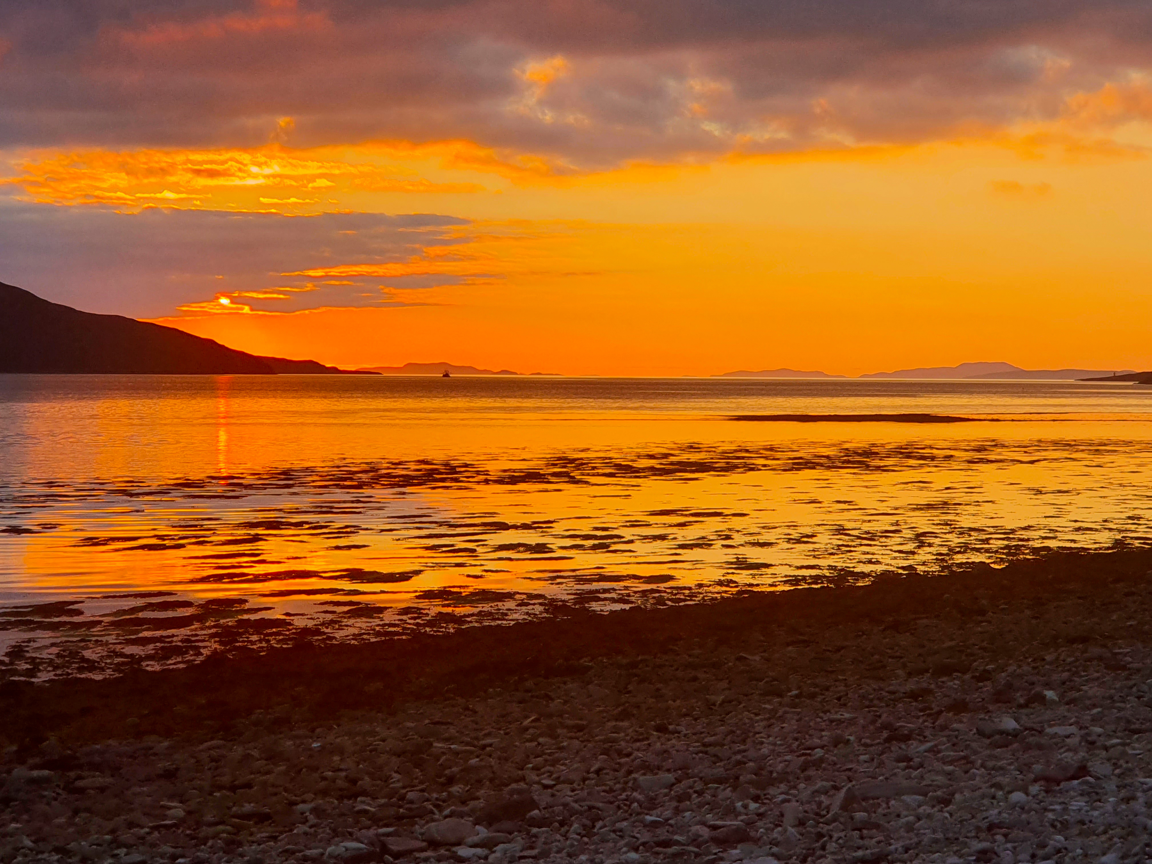 We walked along the beach looking in rock pools and enjoying the evening sun before heading back to the campervan for burgers, hot dogs and gin! As we ate we watched as various campers turned up and hauled their tents and camping gear onto the beach. This was obviously a popular spot for wild camping and when we went for one last walk on the beach before bed we could see why with the sun just gone over the horizon and the cosy campfires it looked amazing.